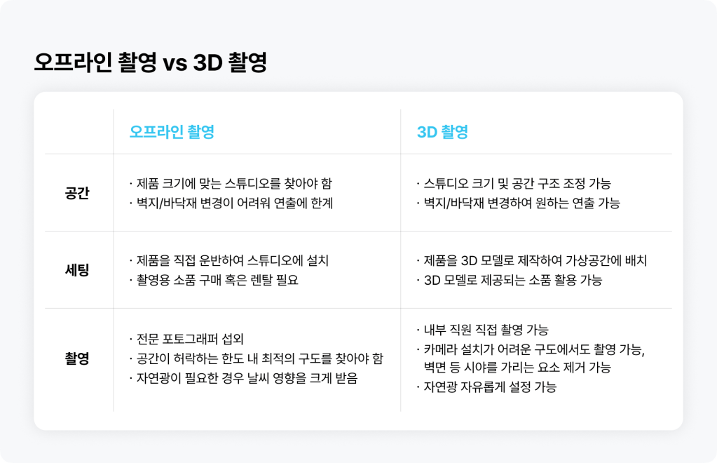 전체 3D 공간 연출에 대한 고민 없이 간단히 연출샷을 촬영하고자 하는 브랜드사에서 이용할 수 있는 간편 촬영 서비스도 있구요.
