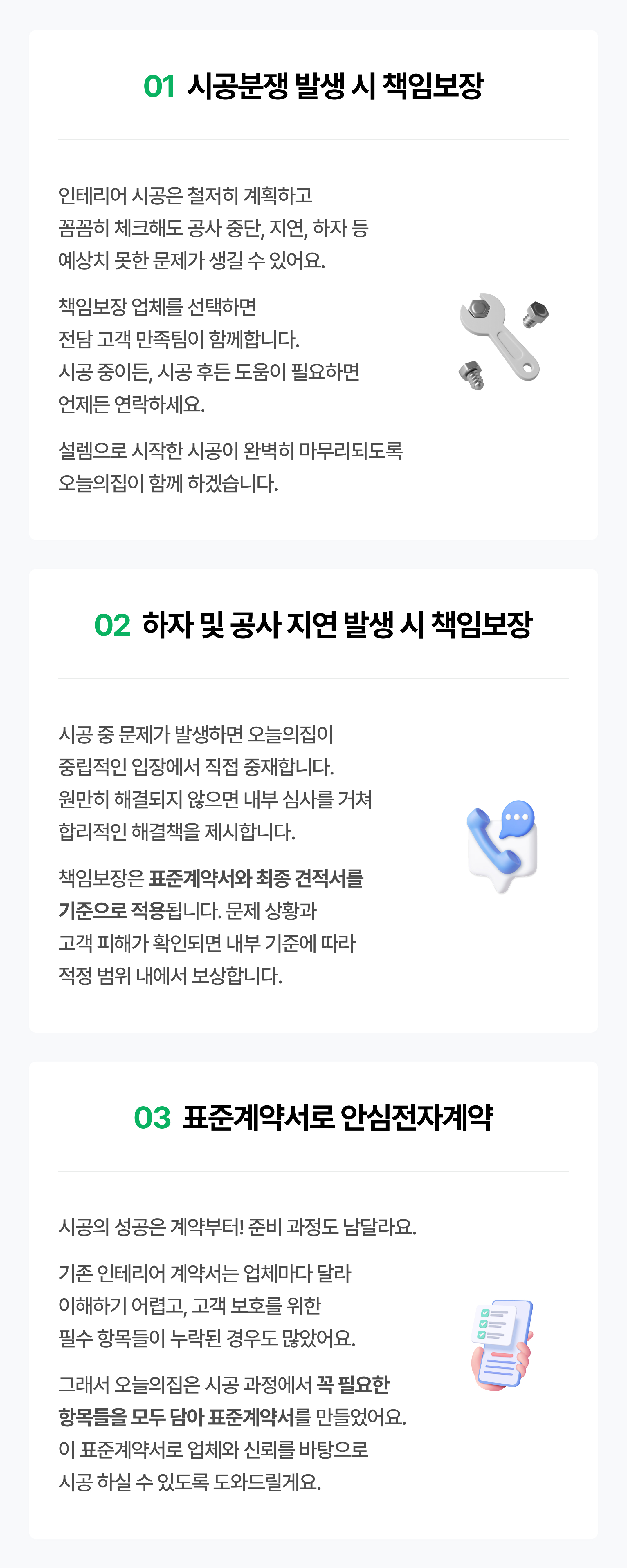 거기다 만일 분쟁 등으로 인해 시공 지연이 발생했고 이로 인해 고객 손실이 있었다면 시공사 귀책이 확인된 경우 숙박비, 짐 보관료를 포함해 하루 최대 25만원까지 현금 보상도 제공해 드립니다. 당연히 시공 계약에 명시된 사후관리(AS, 최소 1년)도 확실히 보장하고 있습니다.