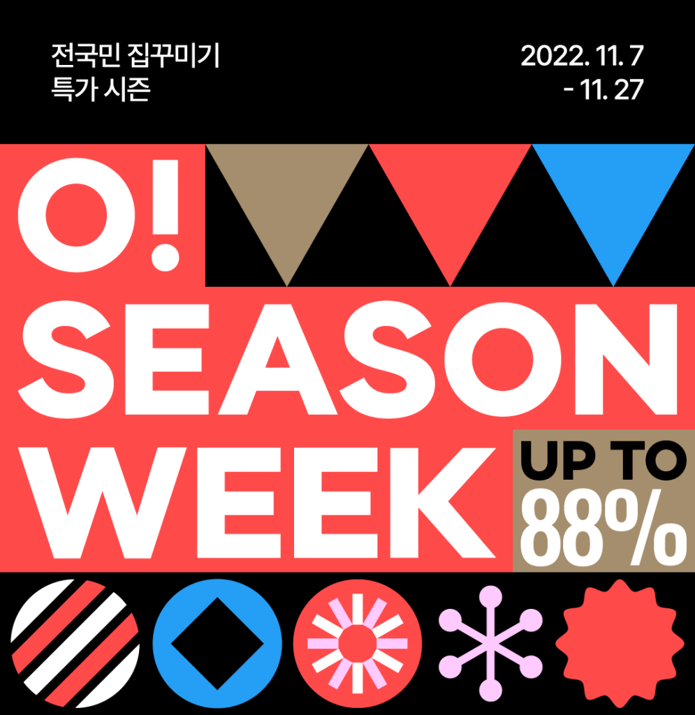 오늘의집은 지난 7일부터 계절 변화에 맞춰 고객들이 오늘의집을 떠올리고 방문하도록 시즈널 상품과 라이프스타일 콘텐츠를 제공하는 ‘오시즌위크’를 진행 중이다. 블랙프라이데이 시즌과 맞물려 디지털 가전, 대형 가전, 청소주방가전, 해외직구 상품 등 시즌 히어로 상품들을 최대 88% 할인가로 제안한다. 이외에도 겨울, 블랙프라이데이, 크리스마스 세 가지 테마로 ‘블프 맞이 요즘 핫한 프리미엄 브랜드 5’, ’겨울 이불 1분 만에 고르는 팁’, ‘3일 완성 크리스마스 홈파티 노하우’ 같은 트렌드 콘텐츠도 선보인다.