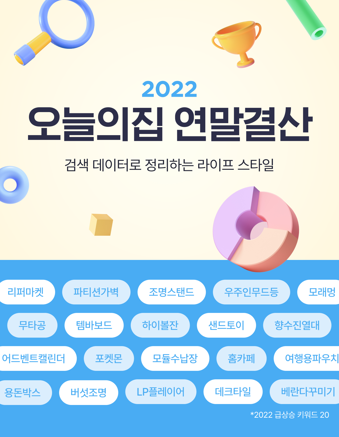 1월에는 ‘강아지한복’이 인기 검색어에 올랐는데 이는 전체가구의 30%에 가까운 600만가구가 반려동물을 키우는 국내 트렌드를 반영한 결과로 해석된다. 2월엔 서울 북촌과 익선동에 레트로 LP카페가 주목받으며 오늘의집 검색에서도 ‘LP’가 인기 검색어를 차지했다. 본격적인 위드코로나 시작에 따라 야외활동과 관련된 라이프스타일 키워드도 인기검색어에 이름을 올렸다. 4월엔 ‘피크닉 바구니’가 주목받았고, 7월엔 양산과 우산을 겸한 ‘양우산’, 9월에는 ‘캠핑’관련 검색어가 인기를 끌었다.
