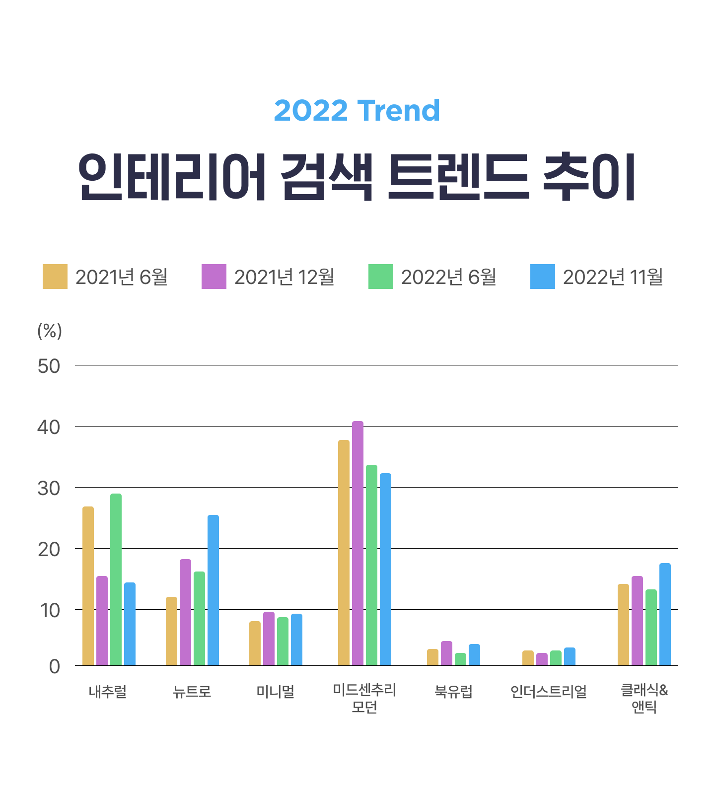 그 결과 최근 2년간 대세 스타일로 자리잡았던 ‘미드센추리모던’에 대한 관심도가 하락하고(1월 검색량 점유율 40.3% → 11월말 31.6%), 선호 취향이 다양해지고 있다는 점을 확인할 수 있었다. 미드센추리모던은 20세기 중반 유행한 가구, 인테리어 스타일로 금속, 유리, 플라스틱 등 다양한 산업용 소재를 활용한 실용적이고 간결한 디자인이 특징이다.